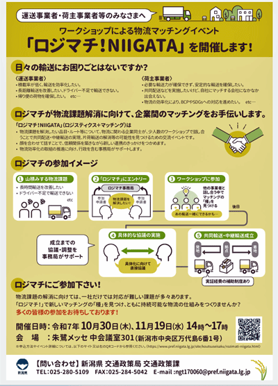 北陸信越運輸局は10月30日、11月19日の2日間、新潟県・関東経済産業局・北陸農政局との共催により、新潟県で物流マッチングイベント「ロジマチ!NIIGATA」を初開催する。