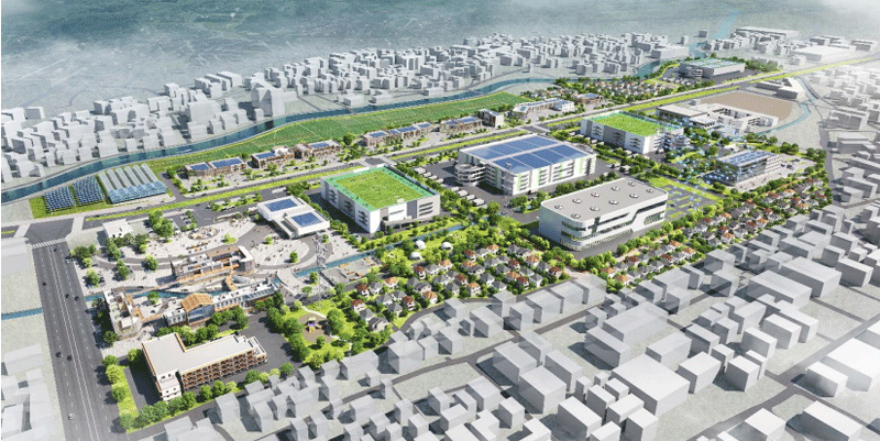 <提案段階の予定のイメージパースだが、青い太陽光パネルを設置した物流施設等も描かれている>