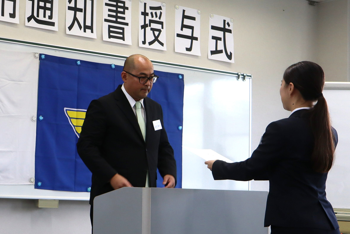 式では、内定者による自己紹介と代表者による決意表明が行われた。その後、高村徹郎 社長が一人ひとりに採用通知書を授与し、入社に向けた歓迎の意を示した。