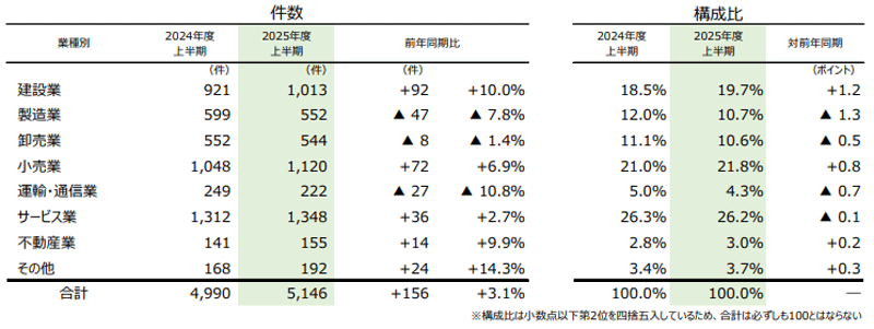 業種別にみると、7業種中4業種で前年を上回った。「サービス業」(前年同期1312件→1348件、2.7%増)が8半期連続で増加し、2000年度以降で最多となった。「小売業」(同1048件→1120件、6.9%増)は過去3番目に多かった。