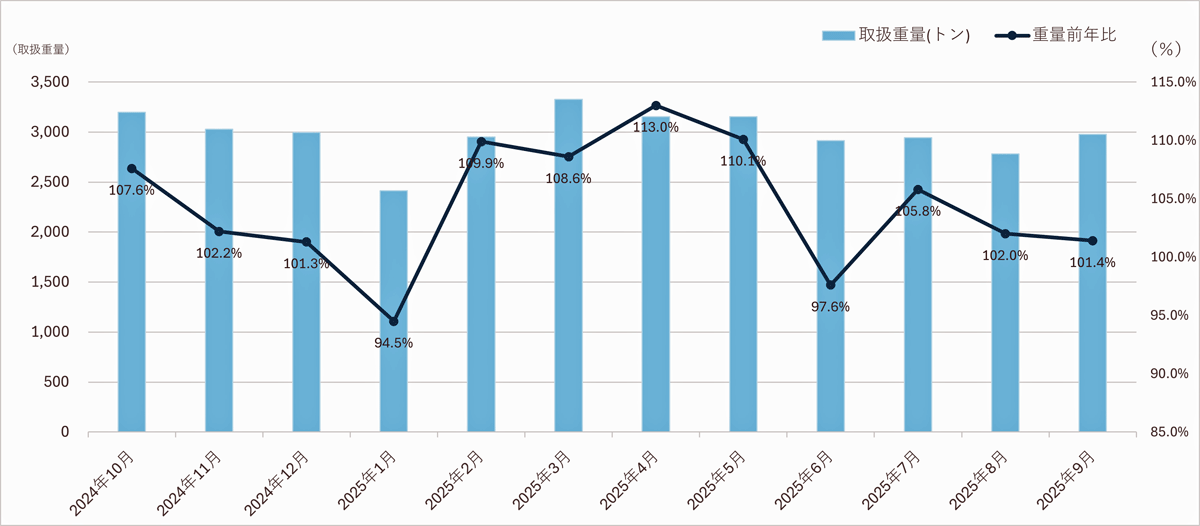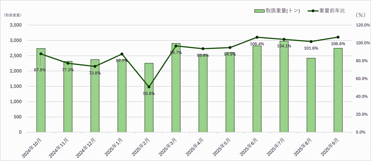 九州は1件(50.0%減)、0トン(36.3%増)だった。