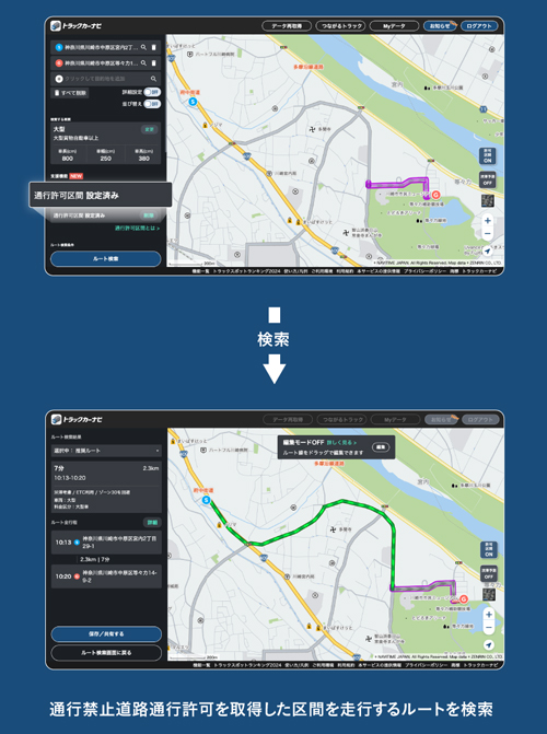 「支援機能」内にある「通行許可区間」で許可取得している区間を設定すると、その区間を通行可能な道路として含んだ上で、最適なルート検索ができるようになる。