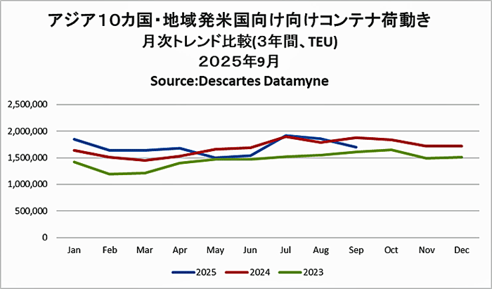 <アジア10か国・地域発米国向けコンテナ輸送 月次トレンド比較 2025年9月>