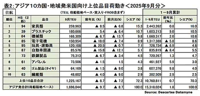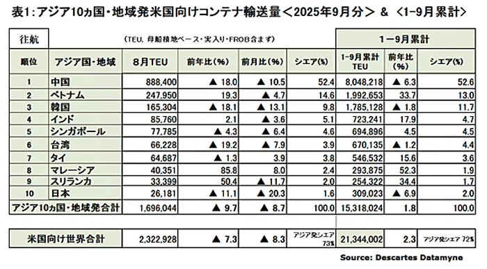 デカルト・データマインは10月14日、米国税関B/L統計を基にまとめたアジア発米国向け(往航)2025年9月分の海上コンテナ輸送量実績データを発表した。