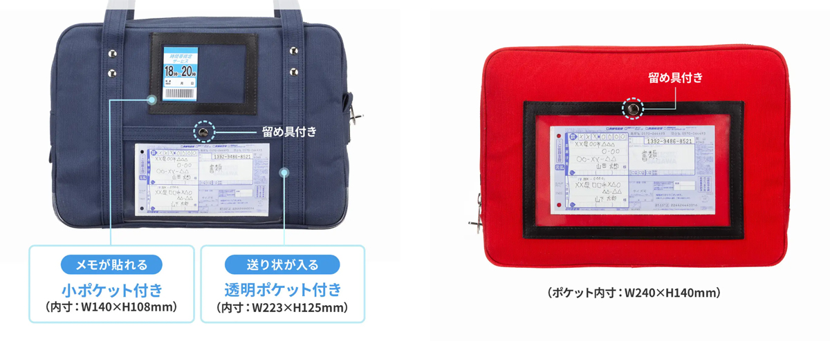 バッグのほうには、メモを貼ったり入れたりできる小窓ポケットも付いており、「送付時間帯」「至急」「取扱注意」など表示し、配送中のミスを防止できる。