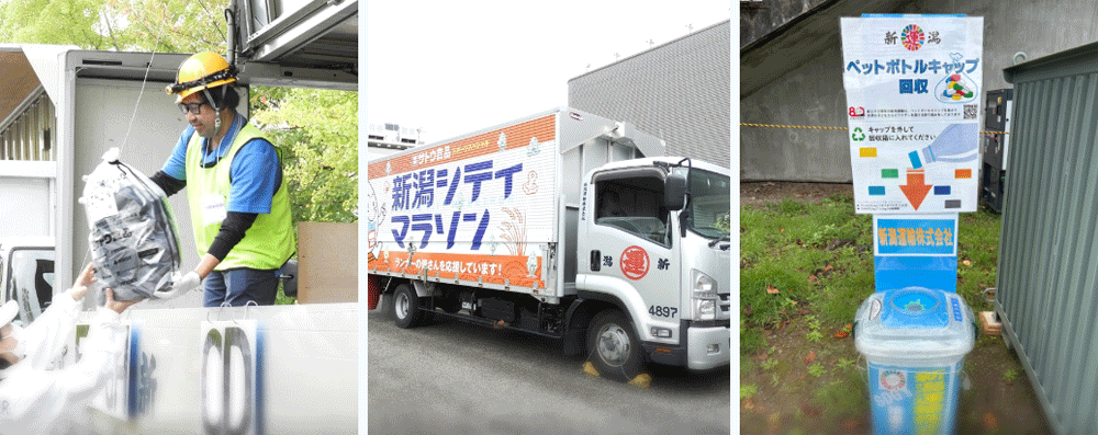 <左から、スタート地点の手荷物の預かり、ラッピングトラック、ペットボトルキャップ回収>