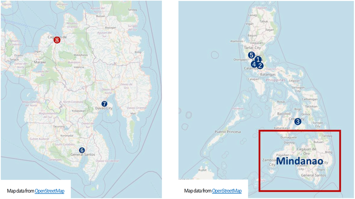 <ミンダナオ島(左)、フィリピン全土(右)の地図と拠点展開>