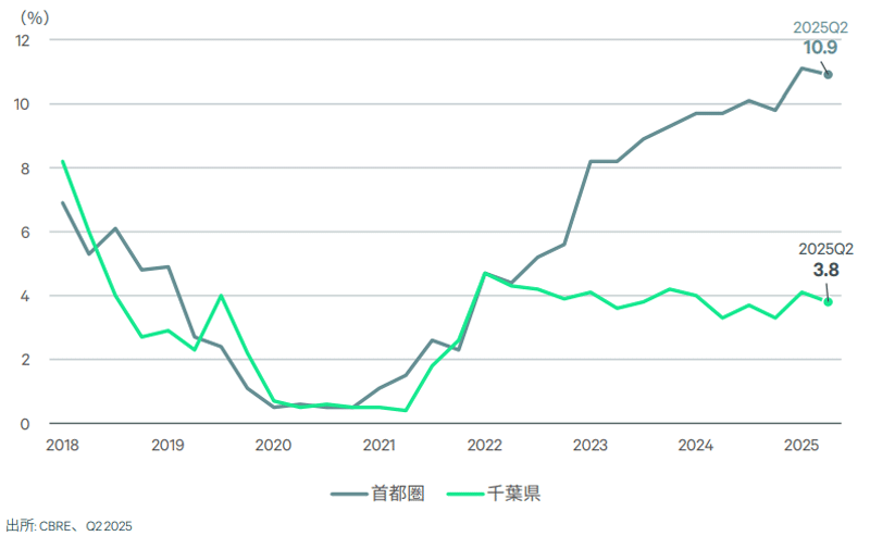 それによると、千葉県の空室率は首都圏の中では際立って低いことを明らかとしている。首都圏全体の空室率は、2020年Q4の0.5%を底として、上昇基調が続いており、直近2025年Q2は10.9%と高止まりをしている。