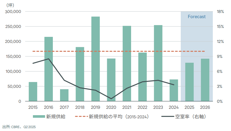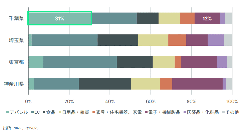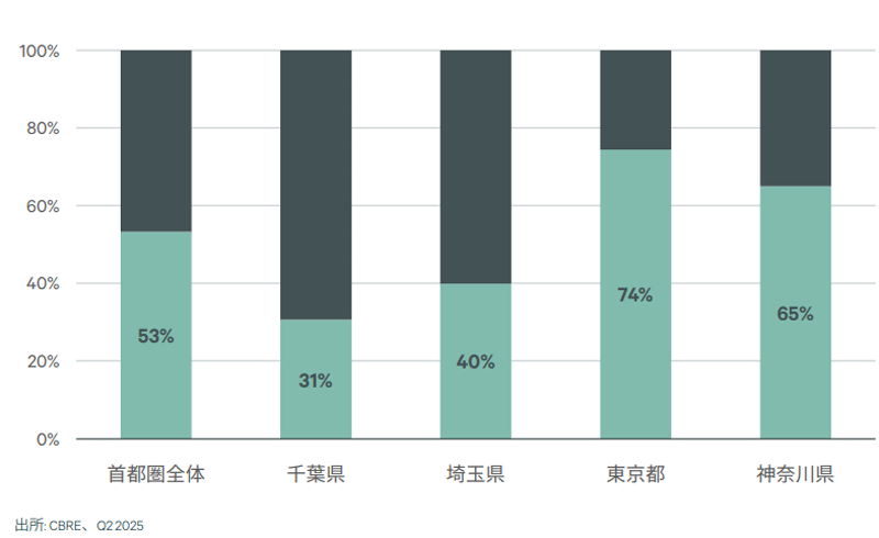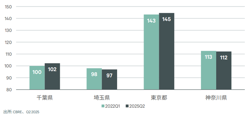 さらに、相対的に割安な賃料水準も大きな要因としている。2022年Q1時点の賃料を比較すると、千葉県の賃料は東京都を43%、神奈川県を13%下回っていた。低い空室率を背景に、千葉県の賃料は2025年Q2までの3年間で約2%上昇したが、依然として東京都、神奈川県との間には、2022年Q1時点と同程度の差が維持されている。