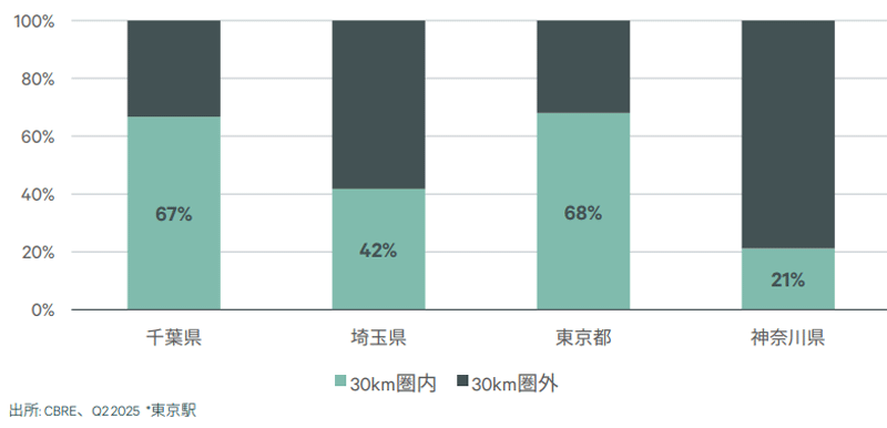 <2022年Q1~2025年Q2の新規供給のうち、都心から30㎞圏内の割合>