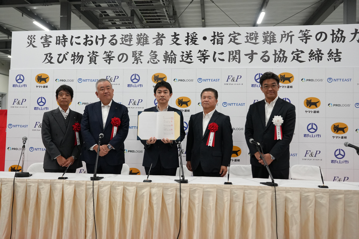 フクダ・アンド・パートナーズ、プロロジス、ヤマト運輸、NTT東日本、福島県郡山市の5者は10月20日、福島県郡山市に竣工した「福島郡山LLタウン」で、「災害時における避難者支援・指定避難所等の協力及び物資等の緊急輸送等に関する協定」の締結式を開催した。