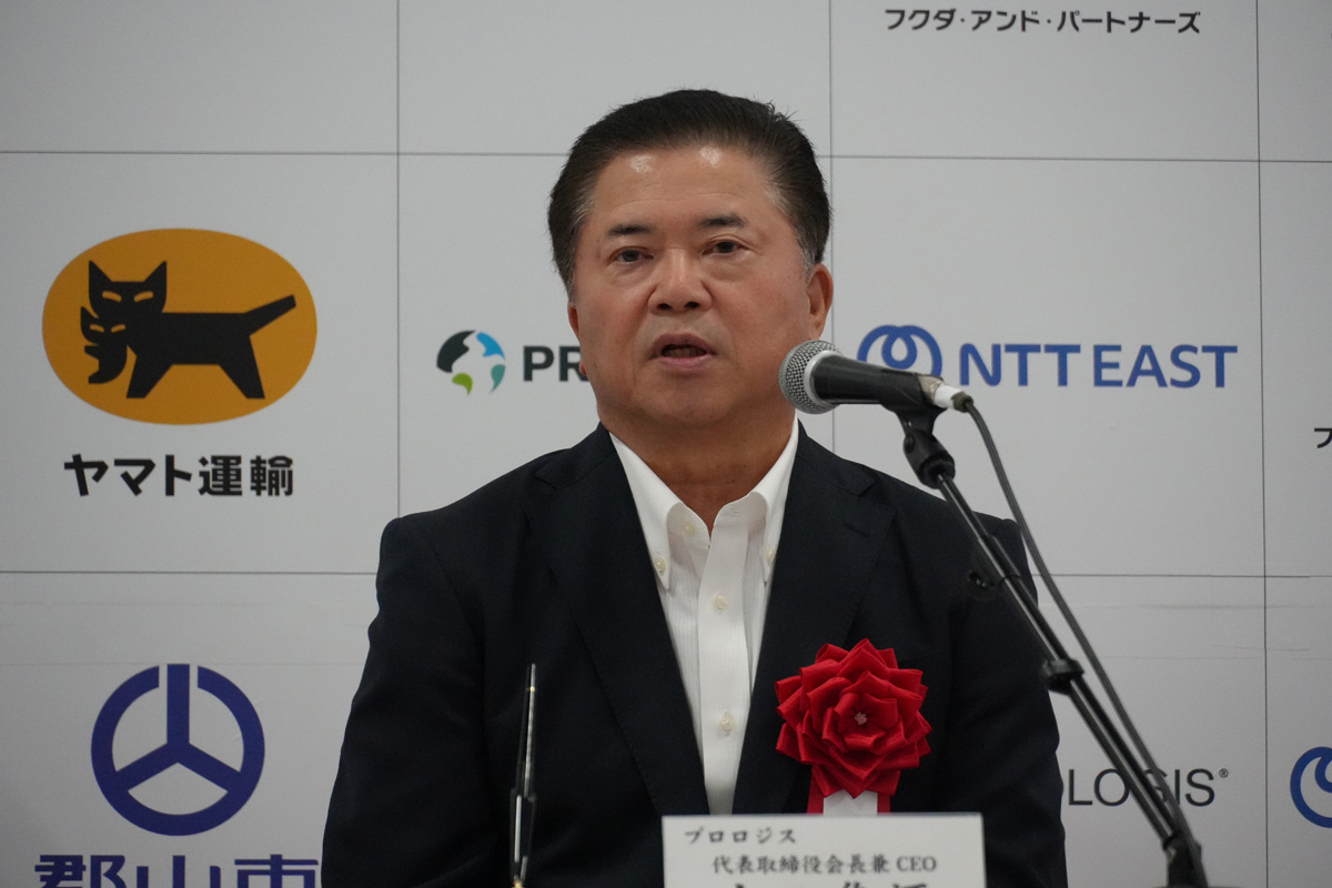 LLタウン内にマルチテナント型物流施設「プロロジスパーク郡山1」を共同開発しているプロロジスの山田御酒 会長兼CEOは、「地域との共生」を掲げこれまで全国14の自治体と防災などに関する協定を結んできたことを紹介。