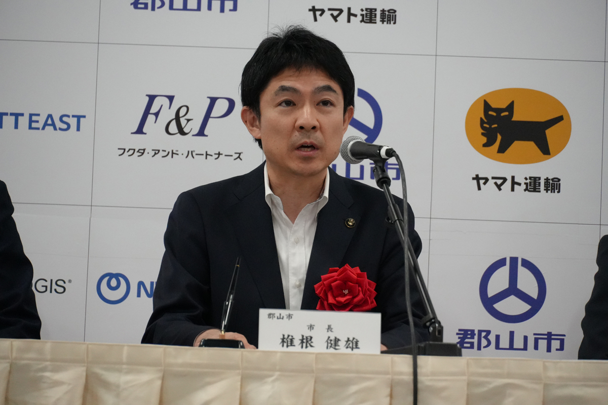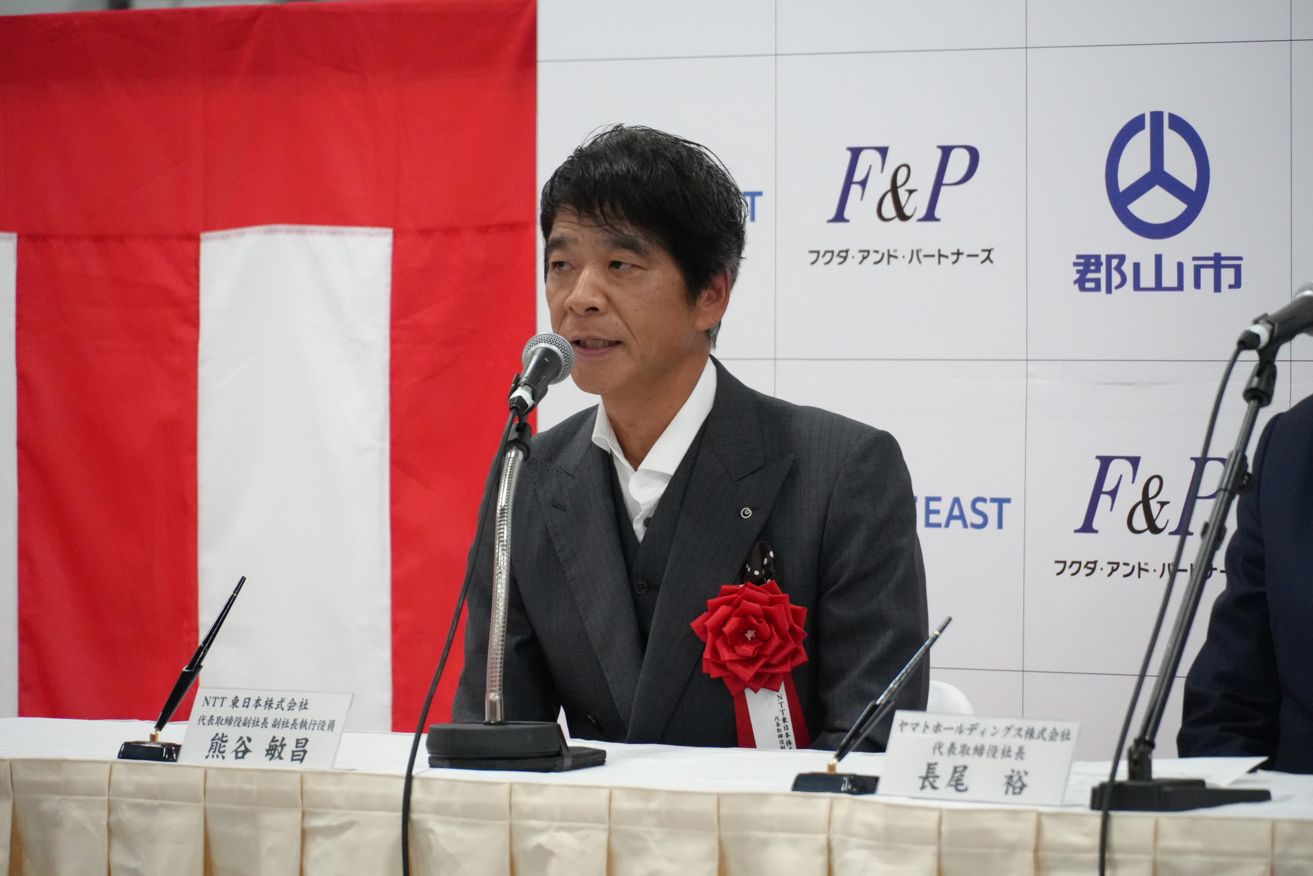 郡山市の椎根健雄 市長は、郡山市では東日本大震災や台風などの影響を踏まえ、防災・減災の取り組みを進めており、今回の協定を大変心強く感謝申し上げたいと挨拶。