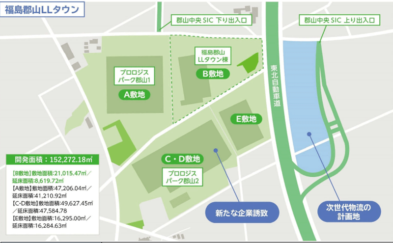 竣⼯した「福島郡⼭LLタウン棟」および 2026年10⽉に竣⼯する「プロロジスパーク郡⼭ 1」は、ともにヤマト運輸のBTS型物流施設(特定企業専⽤物流施設)となる。在、E敷地が既に着⼯しており、CD敷地も2026年の着⼯を予定している。2028年秋に物流施設集積パーク全体の完全完成を⽬標とし、開発を進めている。