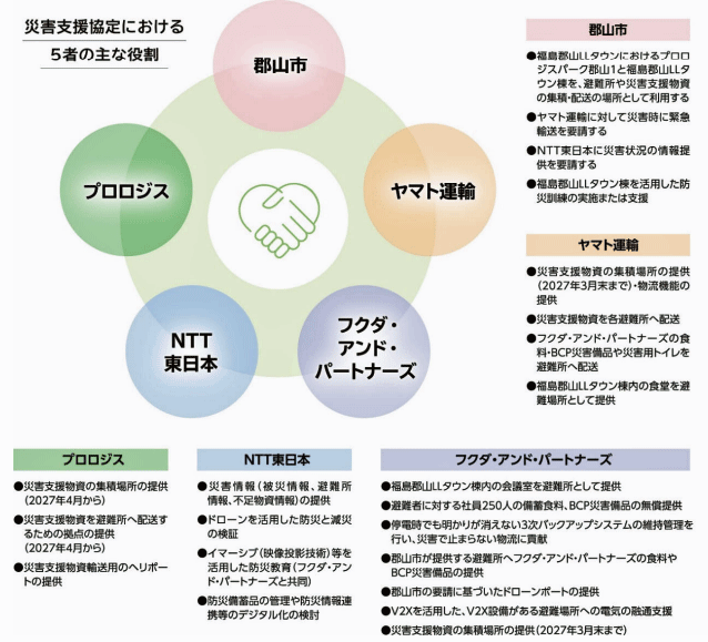 なお、F&Pと郡⼭市、ヤマト運輸、プロロジス、NTT 東⽇本 福島⽀店の5者による「災害時における避難者⽀援・指定避難所等の協⼒及び物資等の緊急輸送等に関する協定」を締結した。協定は、「福島郡⼭ LL タウン」を核として「⼈の暮らしを⽀える物流施設」と「⼈の命を守る防災機能」を融合させ、産官連携による地域防災を実現するもの。