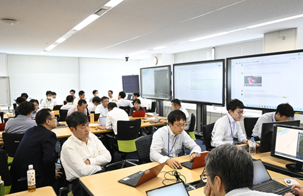訓練の流れとしては、自動車専用船の船舶管理会社であるNYKSMから火災発生の連絡を受け、関係者とのコミュニケーション経路を確立し初動対応を開始。火災状況の悪化、小型船に衝突したことを受けて事故対策本部を設置し、第十一管区海上保安本部と連携しながら救助や安全確保、火災対応の実施を進めた。