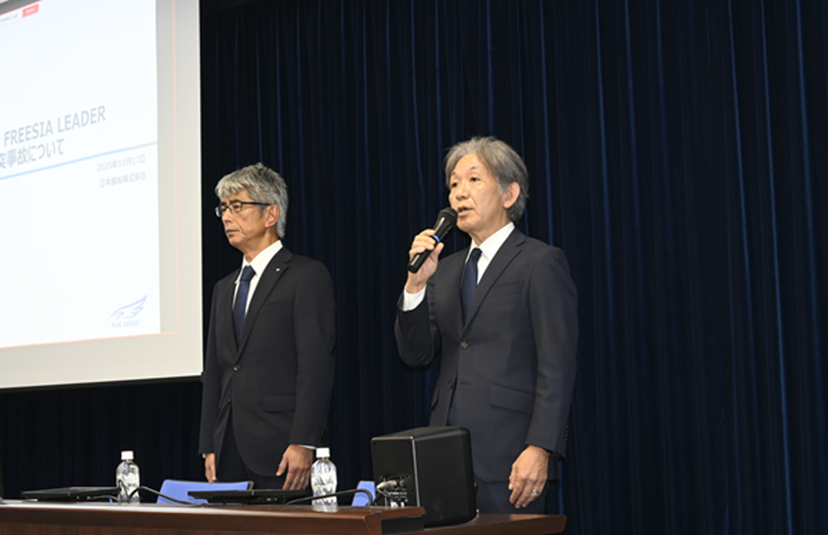 <模擬記者会見の様子。樋口久也 常務執行役員(左)と池田豊 常務執行役員(右)>