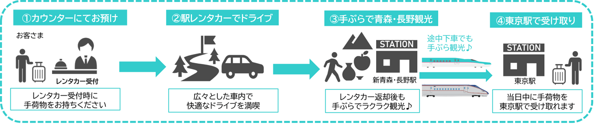 JR東日本グループは10月27日から、JR東日本レンタリース(新青森営業所・長野営業所)でレンタカー受付時に預けた手荷物を、列車荷物輸送サービス「はこビュン」を活用し、当日中に東京駅の指定手荷物預かり所で受け取れるサービスを開始する。