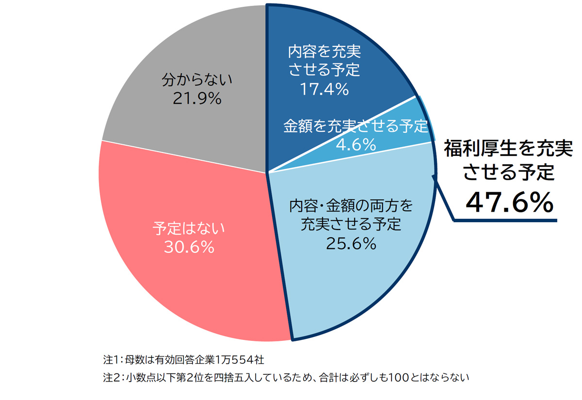 それによると、福利厚生を充実させる予定の企業は47.6%と約半数にのぼった。そのうち、「内容を充実」が17.4%、「金額を充実」が4.6%、「両方を充実」が25.6%となっていた。