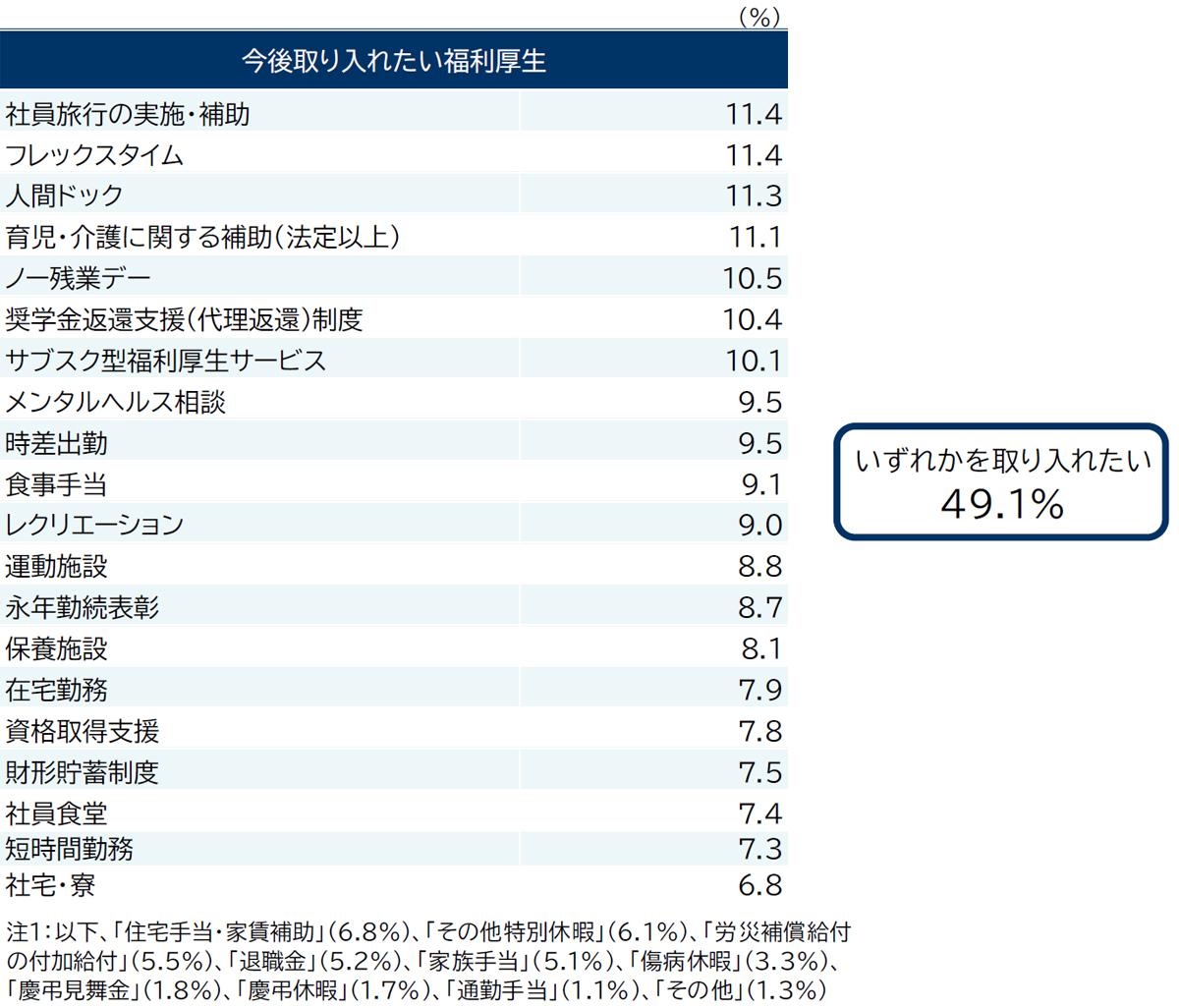 なお、「今後取り入れたい福利厚生」について調査した結果では、「フレックスタイム」および「社員旅行の実施・補助」が、いずれも11.4%でトップとなった。
