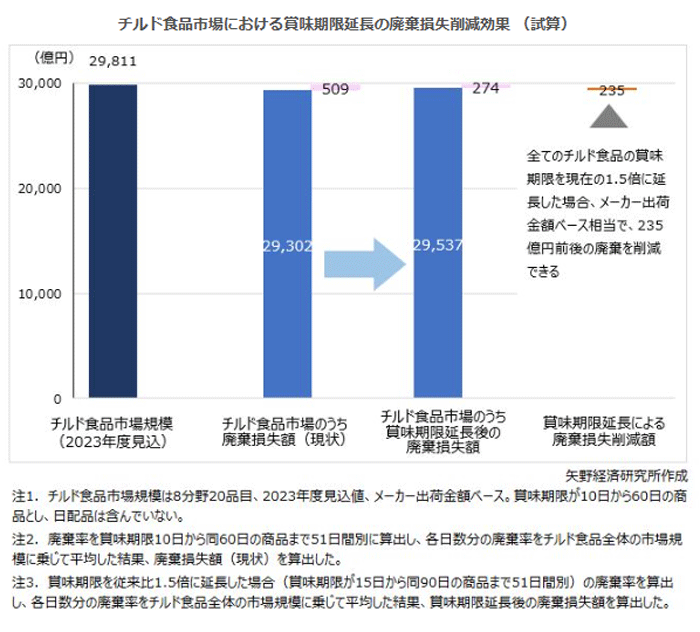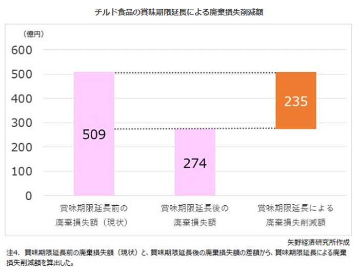 試算では、チルド食品(賞味期限が10日から60日の商品、日配品を除く)の賞味期限を従来比1.5倍にすることで、廃棄損失額は235億円相当削減する効果があるという結果になった。