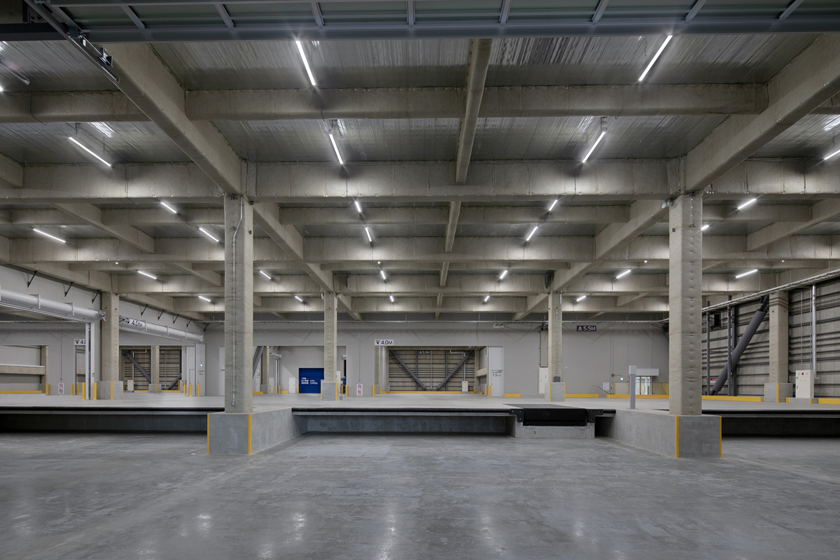 プラットフォームは高床式1.0mで、梁下有効天井高は5.5m(3階部分は6.5m)、床加重は1.5t/m2で、垂直搬送機と荷物用EV各2基装備している。