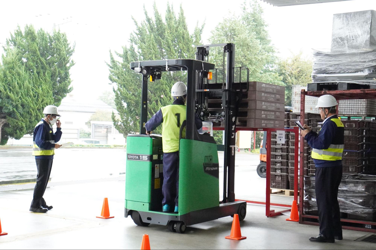 午後の実技試験では、現場で最も使用頻度の高いリーチフォークを使用し、ネステナー(スチール製の保管ラック)の上に積まれたパレットのブロックを、向かい側のネステナーへ移動させるというコースで実施。採点項目は細かく分かれており、基本的な操作から荷役作業まで正確性が問われた。