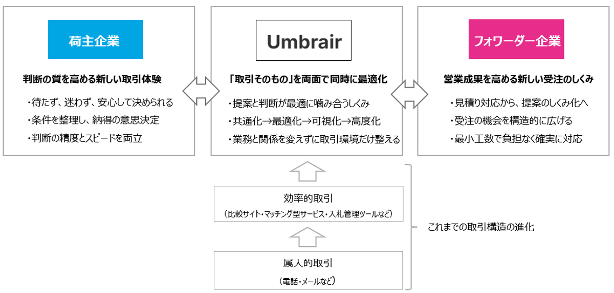 Umbrairは、荷主とフォワーダーのやり取りをオンライン上で一元化し、双方が同じ情報をもとにスムーズに取引できる環境を提供。それぞれの意思と判断を正しく組み合わせることで、手間を減らし、より迅速で確実な取引を可能にする。