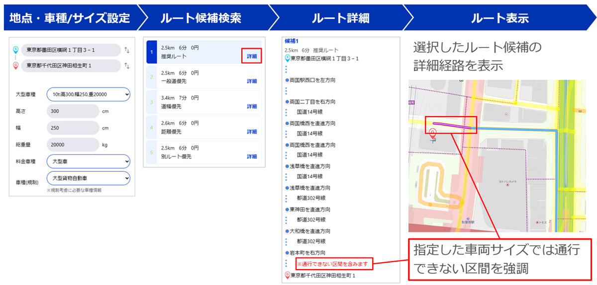 「大型車ルート検索機能」では、車両サイズを設定して大型車が通行可能なルートを検索でき、「道路幅可視化機能」と組み合わせることで、事前にシステム上で目的地までの大型車ルートや、配送先周辺の道路幅を把握することが可能になる。