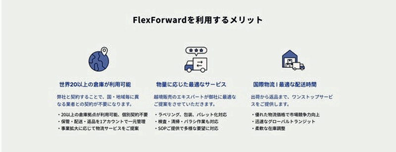 「FlexForward」の特徴は、お得な価格設定のB2B国際配送サービスを採用したこと。また、米国現地倉庫での受注・保管・出荷まで対応するフルフィルメント機能、ECプラットフォーム連携による在庫・注文データの自動同期、店舗や商品の特性に合わせたカスタマイズオプションを挙げている。