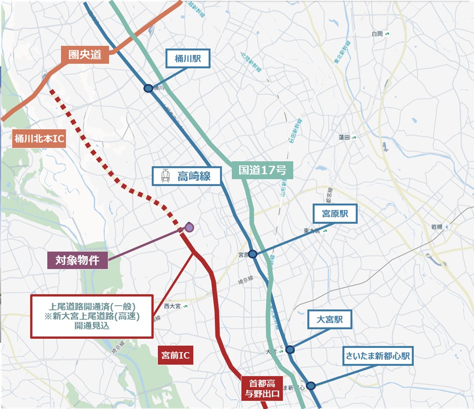 同施設は、大型物流施設の供給が比較的少ないといわれる上尾エリアに位置する。圏央道「桶川北本IC」約8km、JR高崎線「上尾駅」約4kmの立地で、周囲の国道17号と上尾道路を使用した首都圏広域配送における優位性のほか、高速道路「新大宮上尾道路」も開通予定であることによる都心へのアクセス向上も見込まれる。