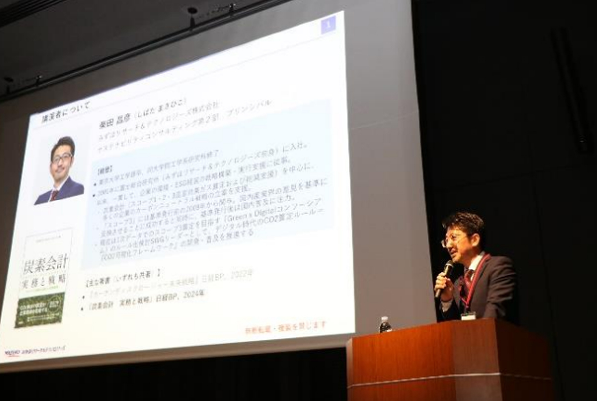 基調講演では、みずほリサーチ&テクノロジーズ・サステナビリティコンサルティング第2部の柴田 昌彦 プリンシパルが「Scope3 削減の重要性とSBT認定~サプライチェーンで取り組む脱炭素経営~」と題し講演。「Scope3」削減はグローバルなサプライチェーンで不可避のテーマであり、取引先との連携が競争力維持の鍵であることを強調した。