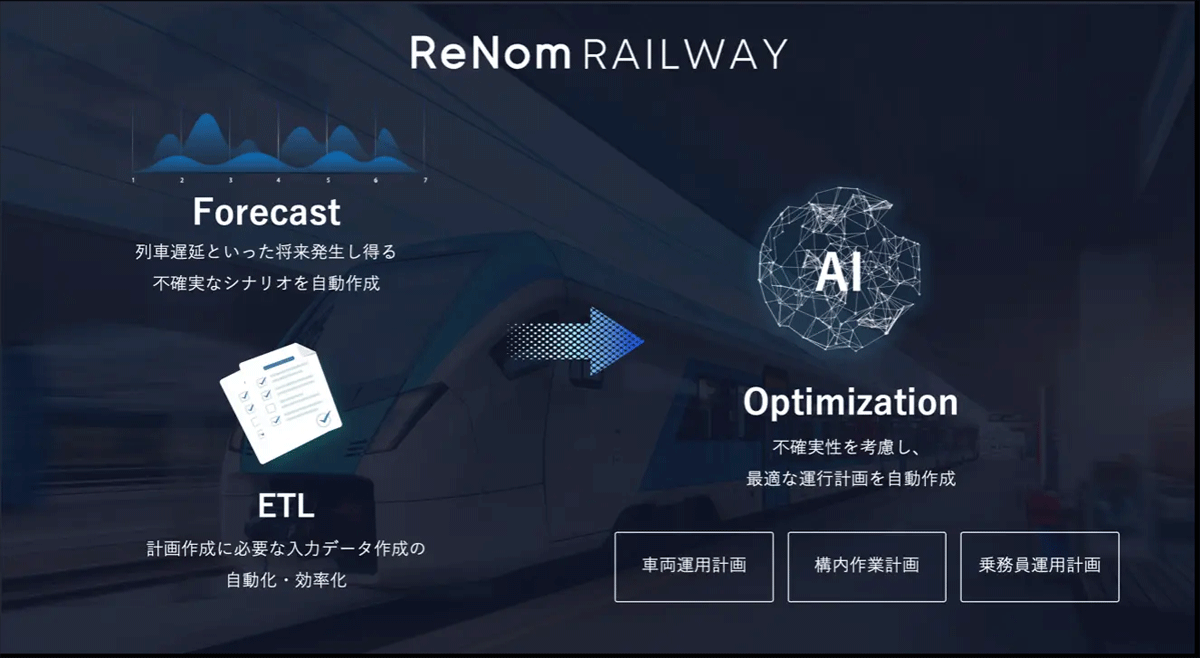 鉄道の輸送計画業務は、列車運用、車両運用、乗務員運用、構内作業など多岐にわたる要素を扱い、膨大な制約条件を満たす必要がある高度な業務。 その多くが熟練担当者の経験に依存し、データ準備や計画立案に多くの工数を要してきた。