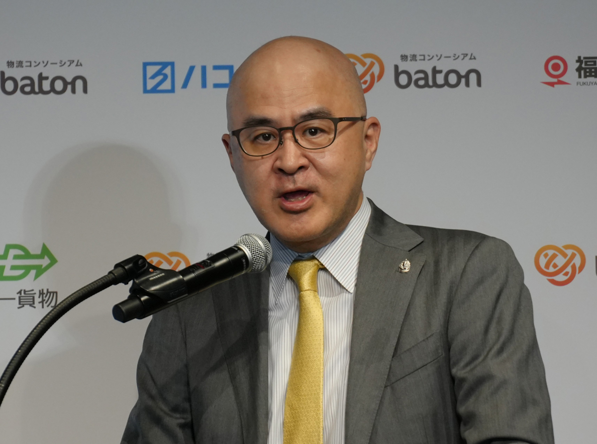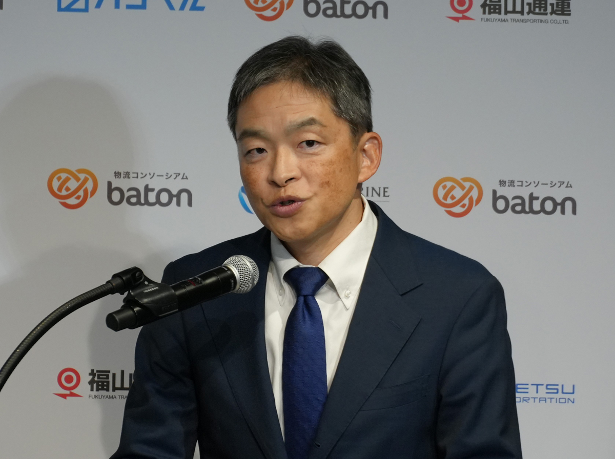 国土交通省物流・自動車局の髙田 龍 物流政策課長は、11月20日に開かれた「物流コンソーシアム baton」の合同記者発表会で来賓講演を行い、batonが来年2月から実施する特積み企業横断型「ドライバー交換方式中継輸送」について、持続可能な物流体系の構築につながる有効な取り組みであるとの認識を示すとともに、現在策定に向けた作業が進んでいる次期総合物流施策大綱でも、中継輸送実施の前提となる標準化やDXが進むよう、国がさらなる普及・拡大を後押しする内容を盛り込む方向で検討していると明らかにした。