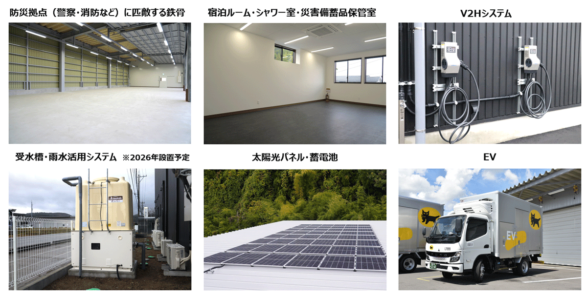 停電対策では、太陽光パネル・蓄電池やV2H(EVから建物に給電が可能なシステム)を設置。断水対策では受水槽・雨水活用システムを設置(2026年設置予定)。帰宅困難者対策では宿泊ルームとシャワー室を設置、災害備蓄品を保管している。