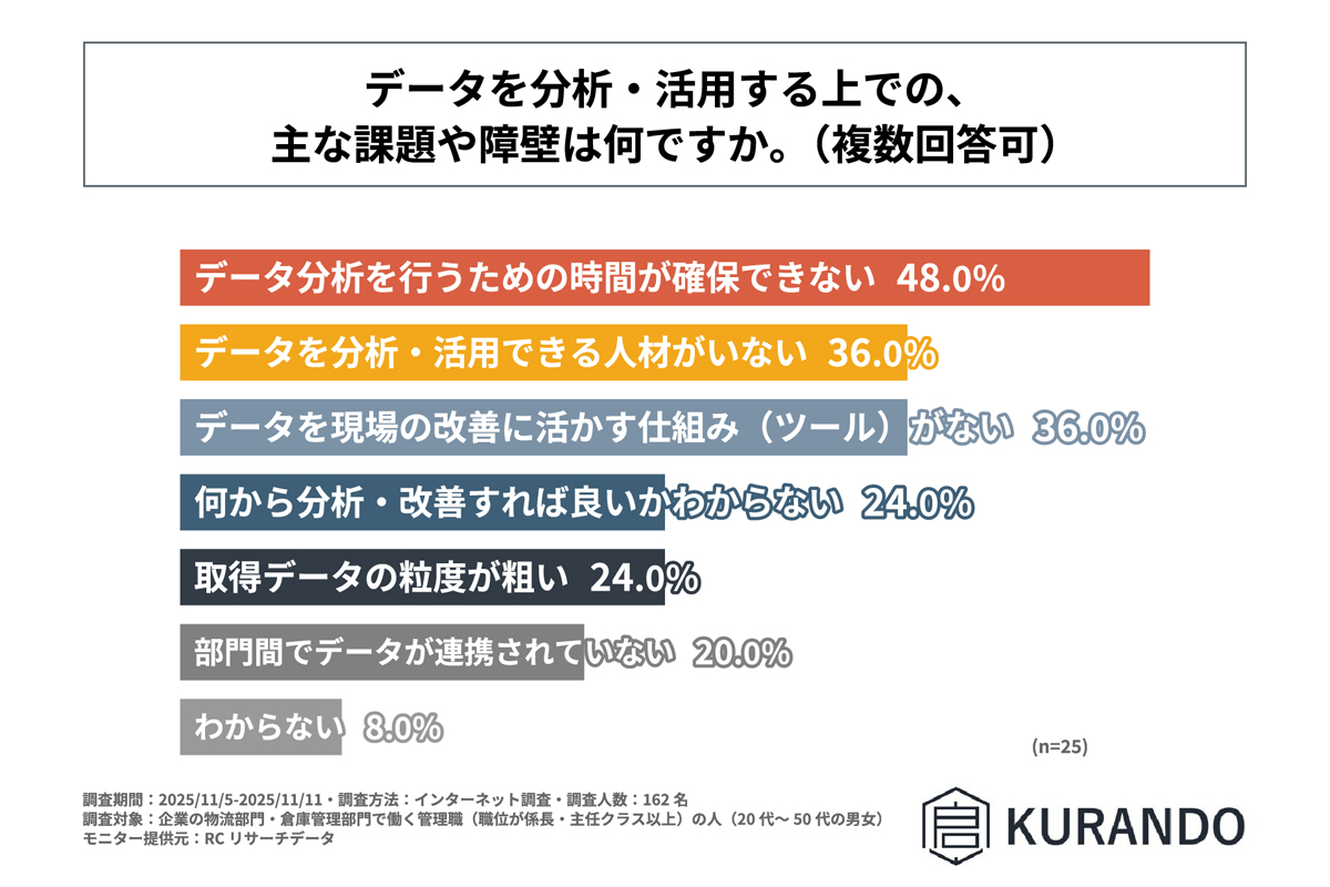 KURANDOは11月26日、企業の物流部門・倉庫管理部門で働く管理職(職位が係長・主任クラス以上、20代~50代の男女)を対象に実施した「物流倉庫のDX推進における”データ活用”に関する実態調査」の結果を公表。約65%が、物流倉庫で庫内状況のデータ取得を行っていると回答する一方、物流倉庫で庫内状況のデータを取得している企業の約24%が、データを活用できていない実態が浮き彫りになった。