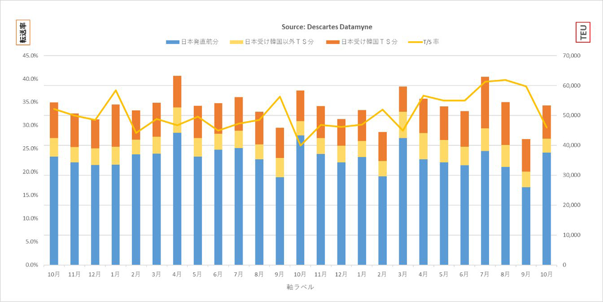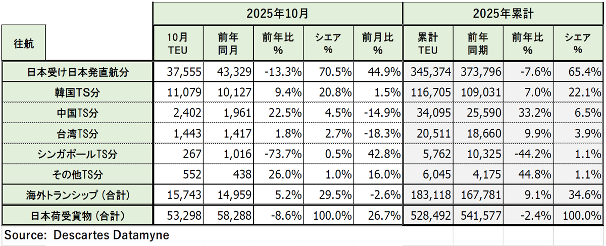日本発母船積みベースでは3万7707TEUで前年比13.3%減。年計では前年比7.6%減。TS貨物が増えた分、母船積み直航貨物が減少している。