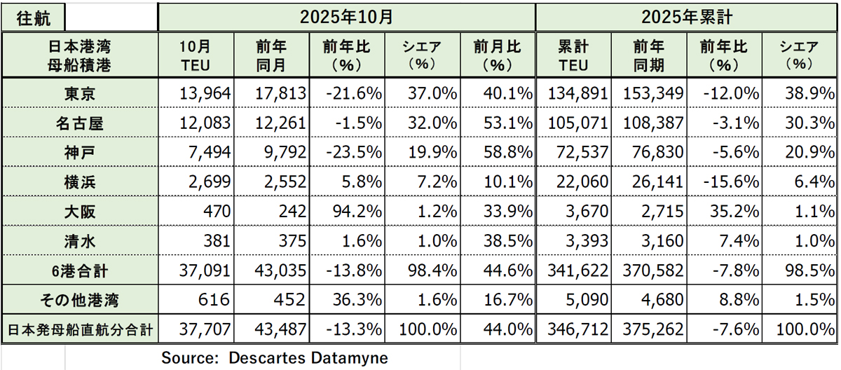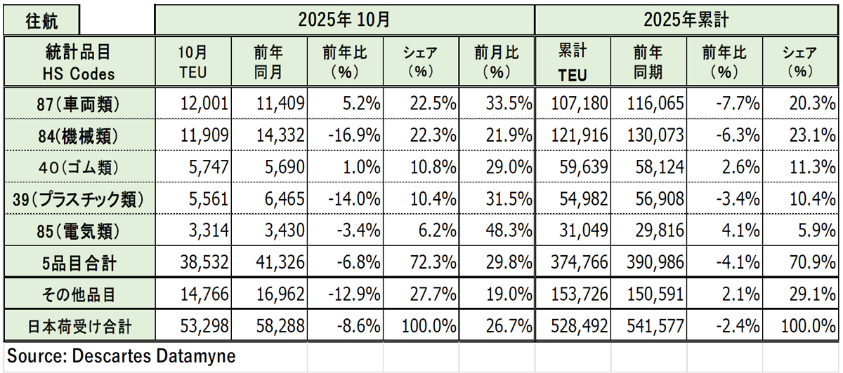 デカルト・データマインは11月27日、米国税関・B/Lデータを基にまとめた日本発米国向け(往航)海上コンテナ貨物量の20フィートコンテナ換算の10月分統計データを発表した。