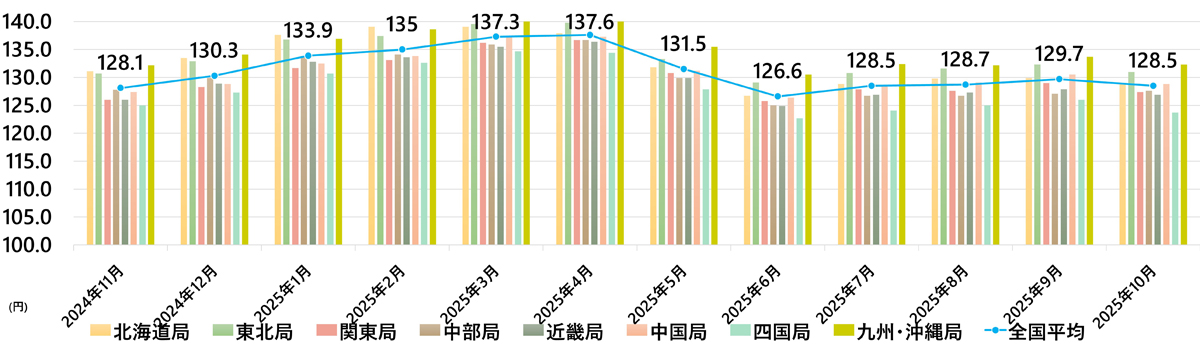 資源エネルギー庁が11月28日に公表した10月の軽油インタンク納入価格は、1リットル当たりの全国平均が128.5円(前月比1.2円減)となった。