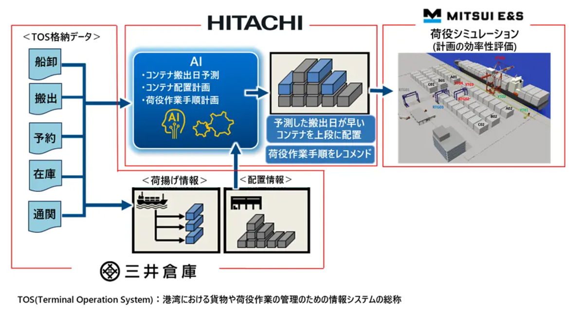 3社は、国土交通省が実施する港湾技術開発制度での技術開発業務(2023~25年度)を受託。港湾でのAIを活用したコンテナターミナル運営効率化技術の開発に取り組んでおり、現地実証では、三井倉庫のコンテナターミナル運営のノウハウを活用しながら、コンテナ貨物の特性データをもとに日立のAIが立案した搬出日予測やコンテナ配置計画、荷役作業手順計画を、三井E&Sが開発した荷役シミュレーターで効率性を検証・評価した上で、実際の作業に一部適用する。現地実証は2026年2月まで実施の予定。