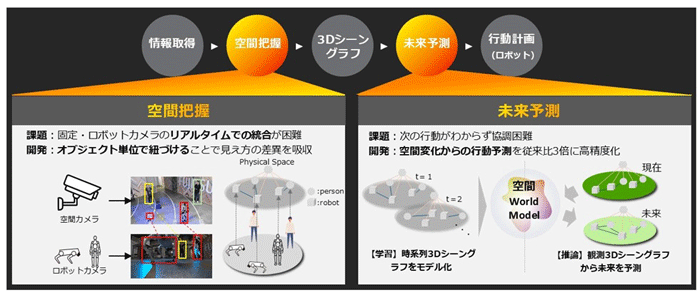 今回、研究センターの成果として、複雑な実空間を把握するコンピュータビジョン技術をベースに、実用的なフィジカルAIを実現する空間World Model技術を開発。
