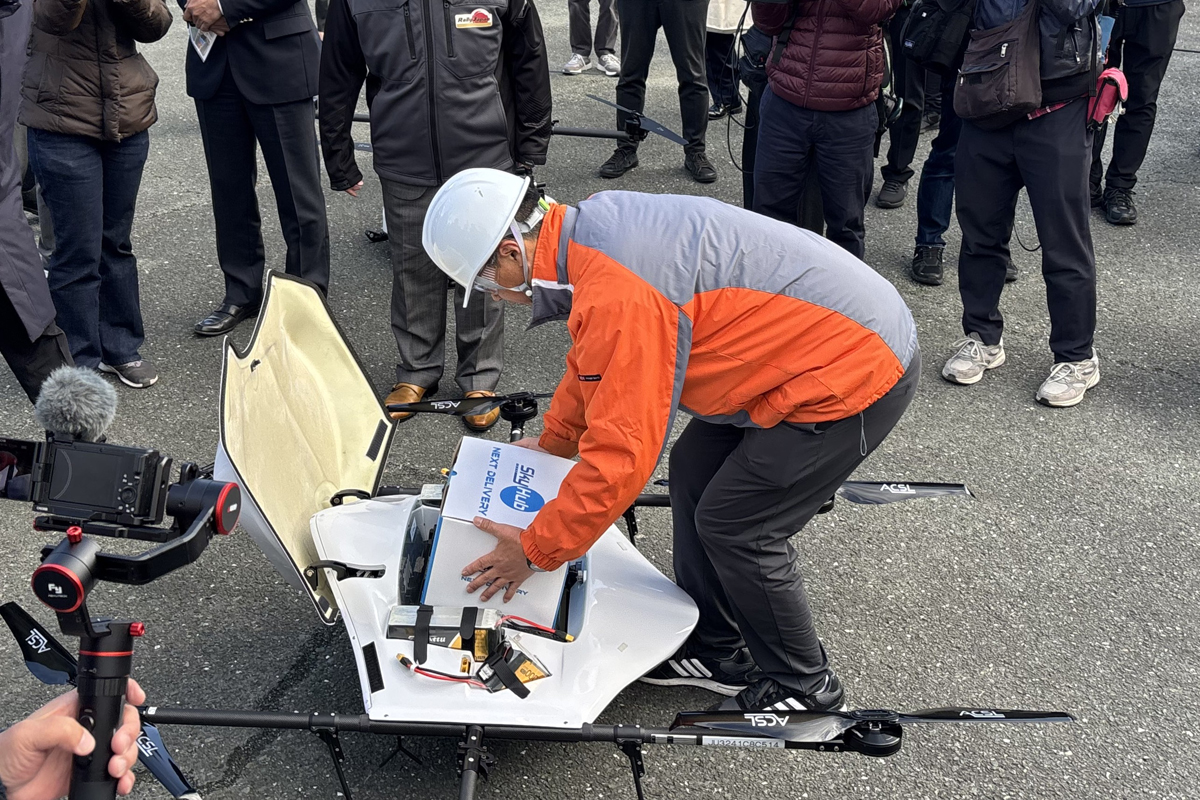 <物流専用ドローン「AirTruck」に荷物をセットする様子>