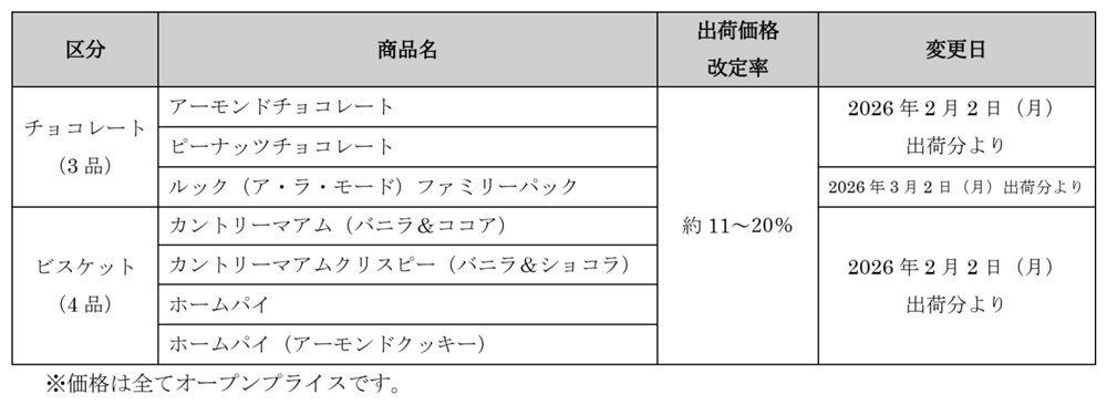 不二家は20226年2月から、菓子の一部商品を約11~20%価格改定する。対象商品はアーモンドチョコレートなどチョコレート3品と、カントリーマアム、ホームパイなどビスケット4品。