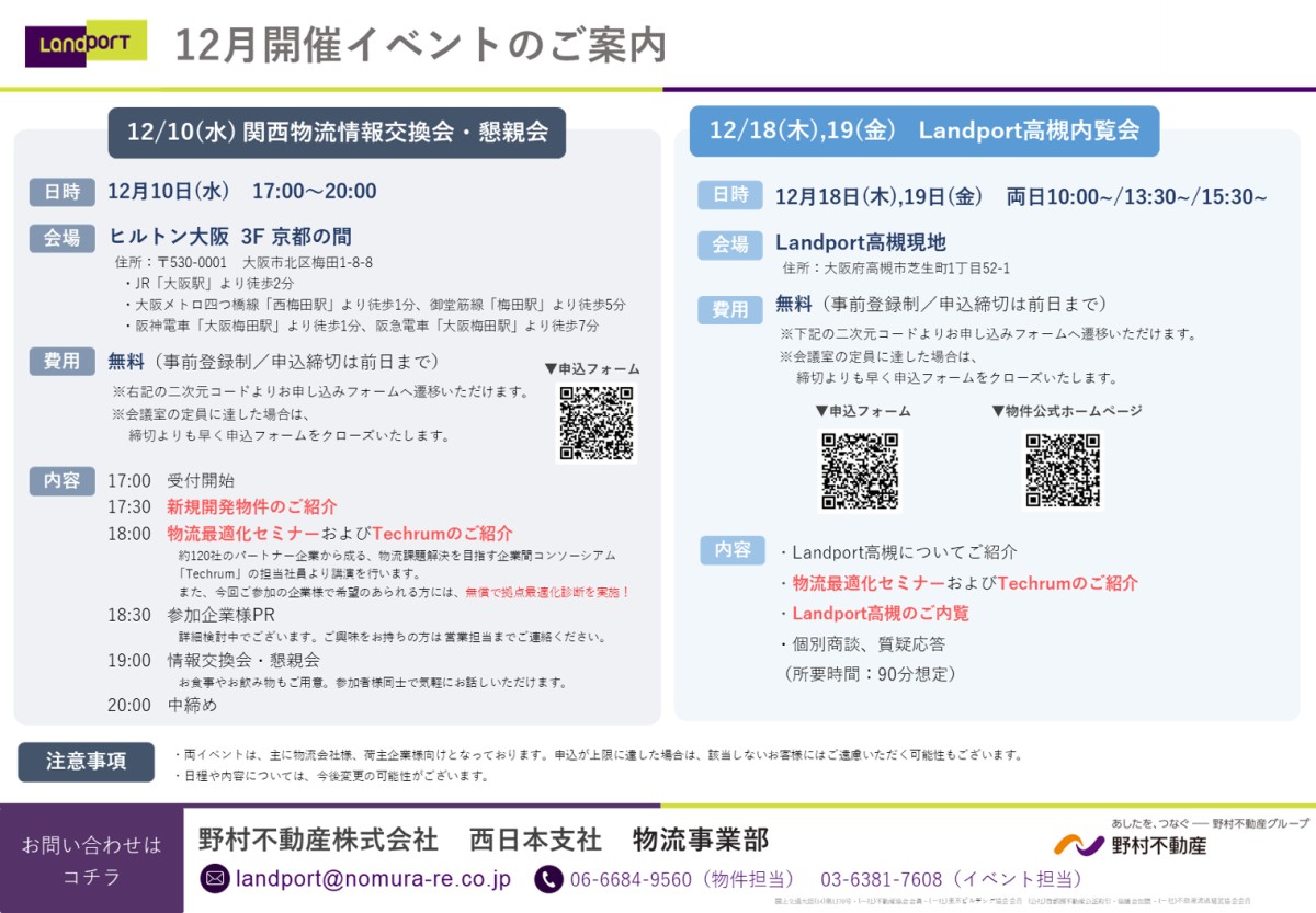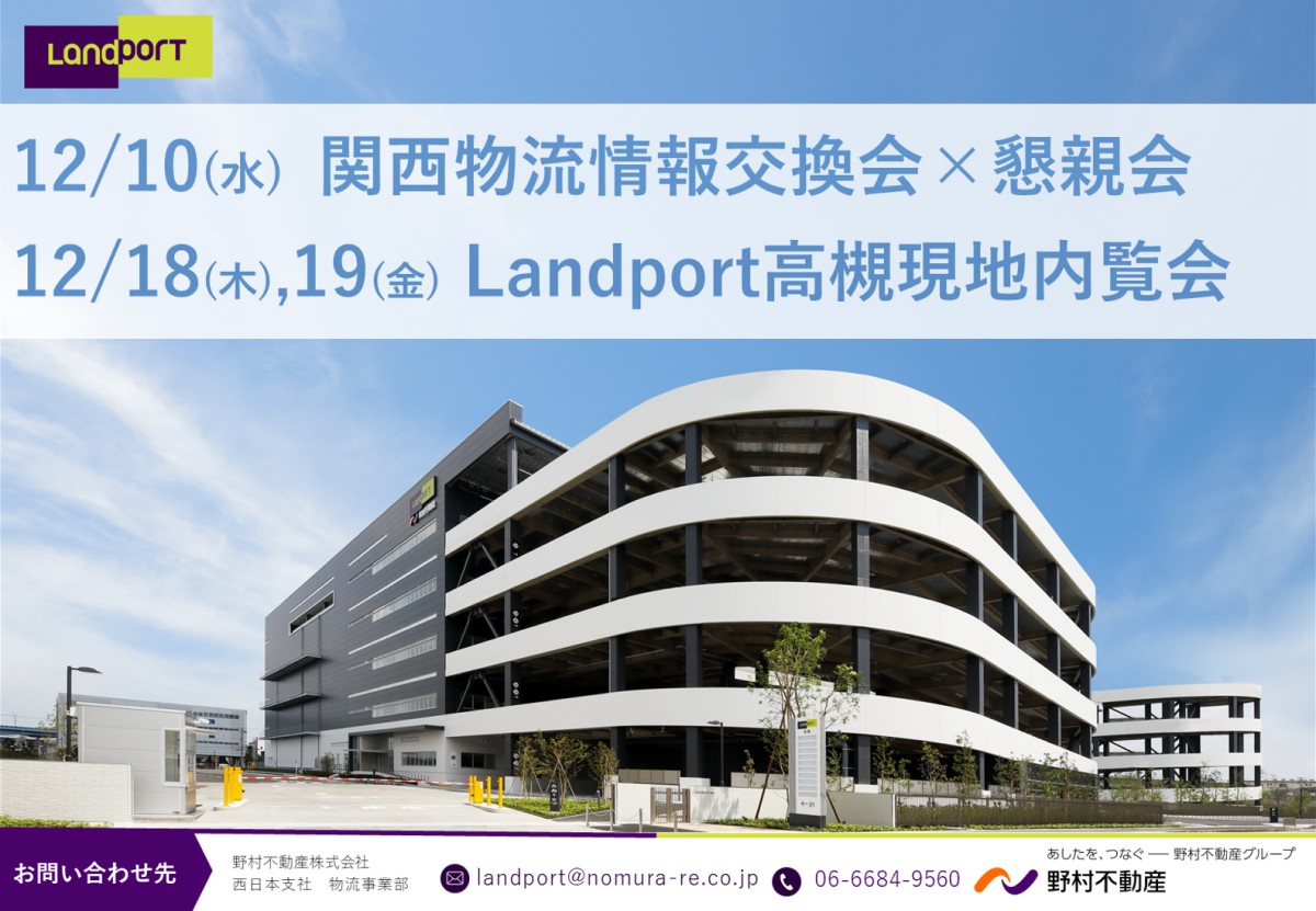 野村不動産は、12月10日に「関西物流情報交換会・懇親会」を、また18日・19日に「Landport高槻内覧会」をそれぞれ開催する。