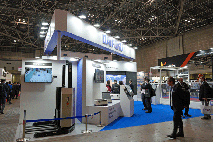 仕分け・搬送システムでは、大手マテハンメーカーのダイフクが「SOTR(ソート)」シリーズの4機種を展示。ピース仕分け用、ケース・コンテナ搬送、パレット搬送のほか、今回、無人搬送フォークリフト(AGF)「ソーティングトランスファーロボット F」を初展示した。無人搬送フォークリフトはコンパクトな車体で、狭い場所でも使える業界最小の旋廻半径1mを実現。またセンサーカメラを用いて自己位置をマッピングできるSLAM(スラム)制御の採用により、レイアウトや環境の変化にもスムーズに対応でき、倉庫の入庫・出庫業務の中間搬送での利活用に引き合いがあるという。