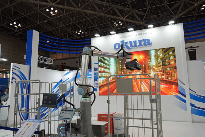 オークラ輸送機は、床レールなどのガイドが不要な自律搬送ロボット「OKURUN(オークラン)」と、ハンドにカメラを搭載したパレタイジング用協働ロボット「EasyPAL(イージパル)」を出展。運搬台車の「積む」「降ろす」「運ぶ」作業の自動化を実演。また3次元走行ロボット「Skypod」を映像と共に展示し、未来型メンテナンス「予知保全サービス」を紹介した。