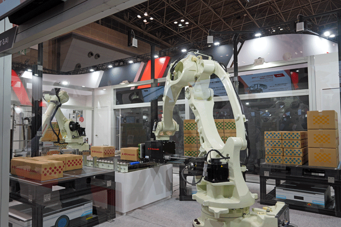 <川崎重工業はAIデパレタイズ(右)と6輪車への積み付けを展示>