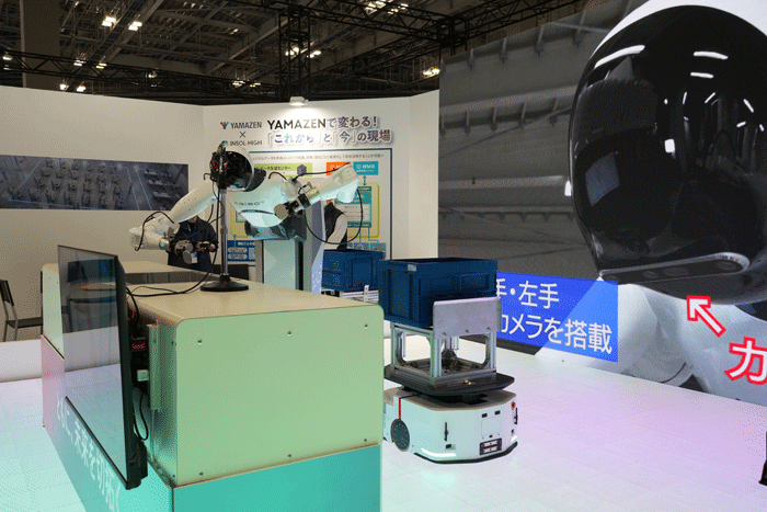 ヒト型ロボット(ヒューマノイド)の展示も見られた。山善は、ヒューマノイドとAMRとの連携のデモンストレーションを初公開。ことし4月から協業しているINSOL-HIGHと、実際の倉庫で取得したフィジカルデータを用い、今回、AMRと同じプラットフォーム制御によりピッキング作業とオリコン移動を連動する様子を実演した。