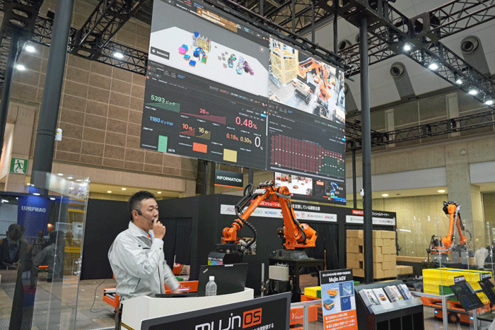 東6ホールを入ってまず目を引くのは、Mujinのブース。総合自動化プラットフォーム「MujinOS」を基盤に、フィジジカルAIとデジタル技術により、現場の様子がブラウザ上でリアルタイムに同期する「最新デジタルツイン工場・倉庫」を再現し、注目を集めていた。