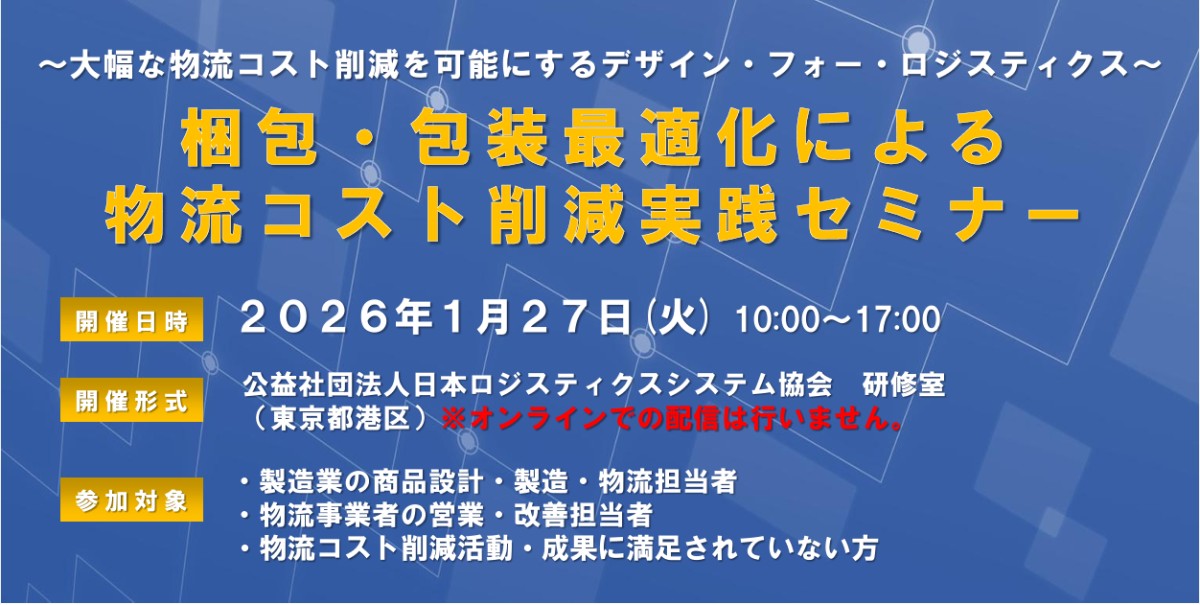 日本ロジスティクスシステム協会(JILS)は2026年1月27日、「梱包・包装最適化による物流コスト削減実践セミナー」を開催する。